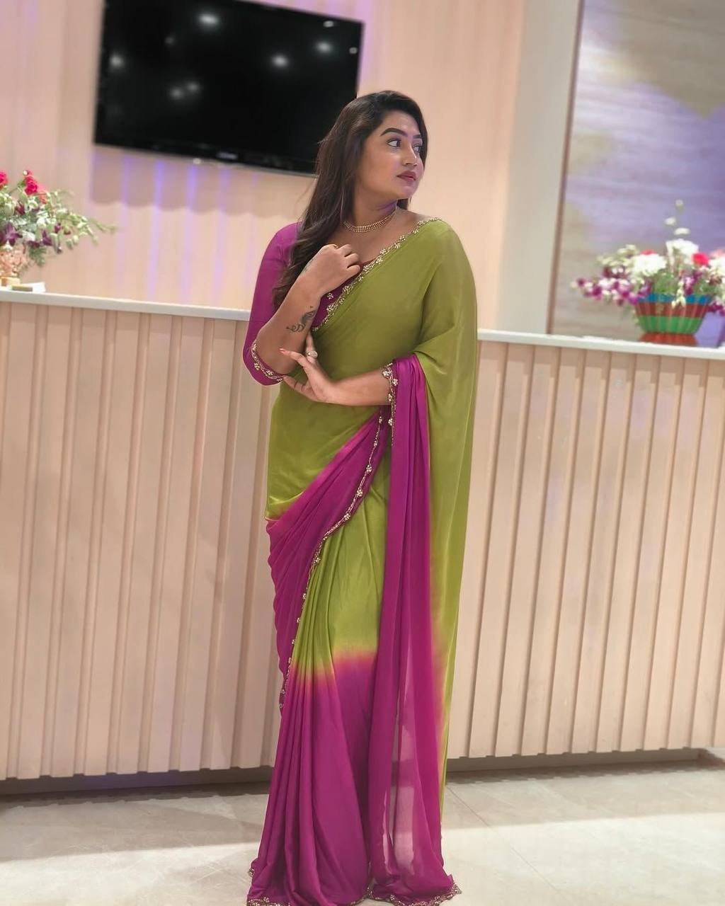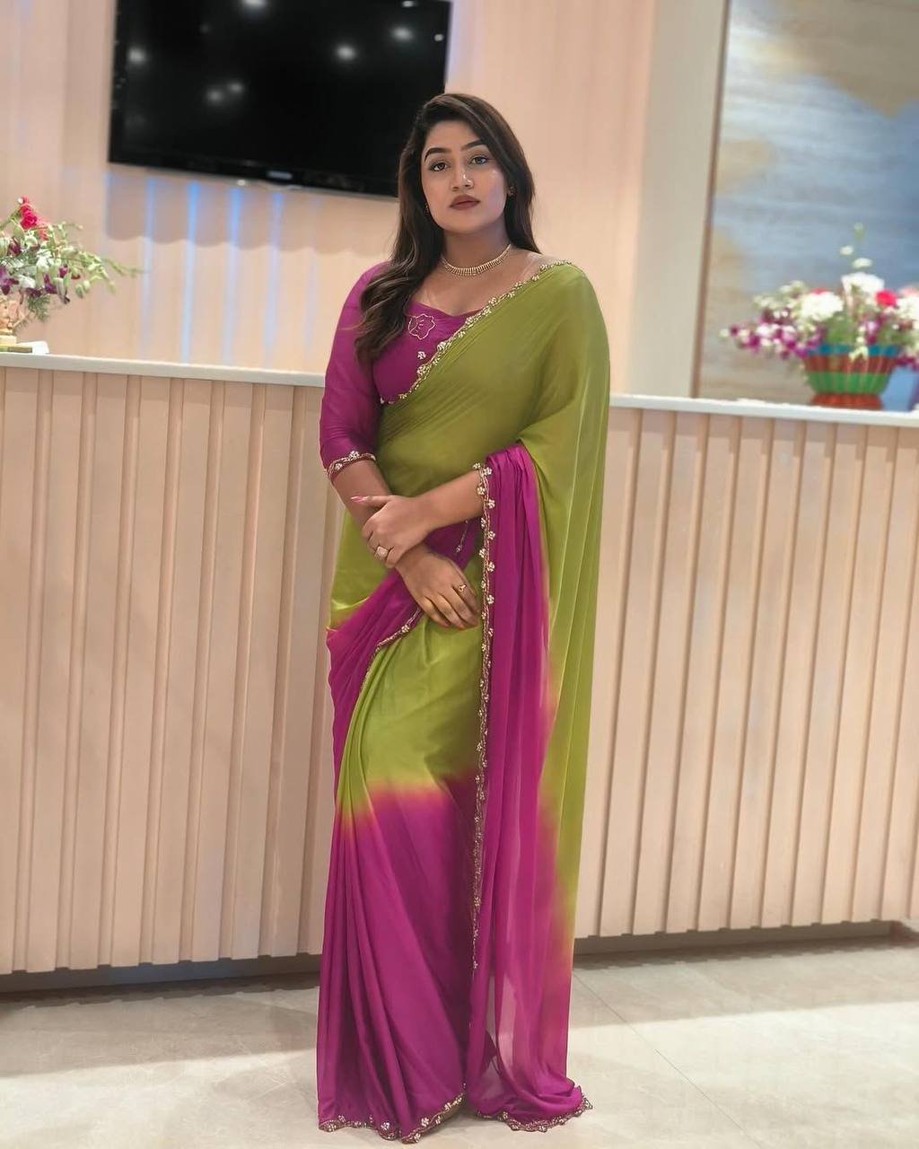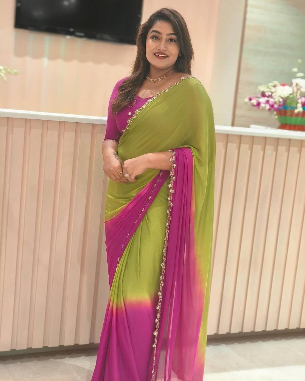 Soft Hand Dyeing Chinnon Fabric With *Padding Color With beautiful handwork done On Border Of Cutdana Moti And Jardosi Attached
